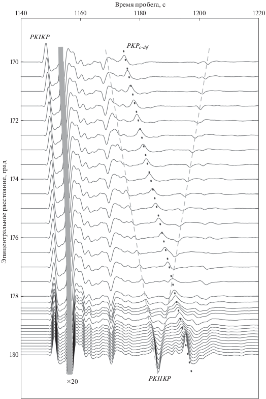 Монтаж синтетических сейсмограмм на эпицентральных расстояниях от 170 до 180°. Масштаб сейсмограмм после серой черты для лучшей визуализации увеличен в 20 раз. Так как энергия второй ветви волны PKPc-dif с более поздними временами вступления в 3 раза меньше, чем в первой ветви, ось синфазности для нее не приведена.