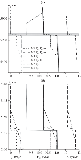 Модификации моделей IASP91 (М1–M4) и аk135 (M5, M6) зоны перехода от внешнего ядра к внутреннему. Обозначения моделей приведены в легенде с указанием номера и списком модифицированных параметров: (а) – разрез в диапазоне глубин от 4900 до 5500 км; (б) – детали разреза в диапазоне 5140–5160 км; Vs – скорость поперечных волн; Vp – скорость продольных волн; ρ – плотность среды.