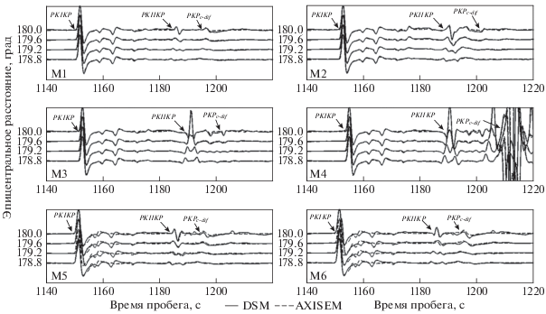 Сравнение фрагментов синтетических сейсмограмм длительностью 80 с для моделей М1–М6, рассчитанных методами DSM и AXISEM, на расстояниях 178.8–180°.