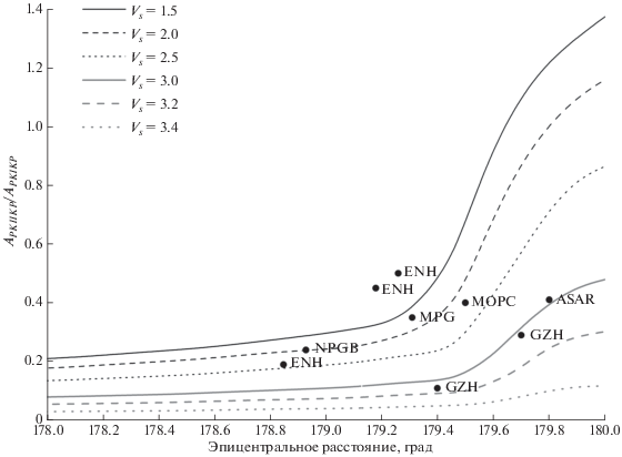 Зависимость относительной амплитуды от эпицентрального расстояния и скорости поперечных волн в вершине внутреннего ядра для стандартной модели ak135. Черные кружки – измерения отношения амплитуд из таблицы.