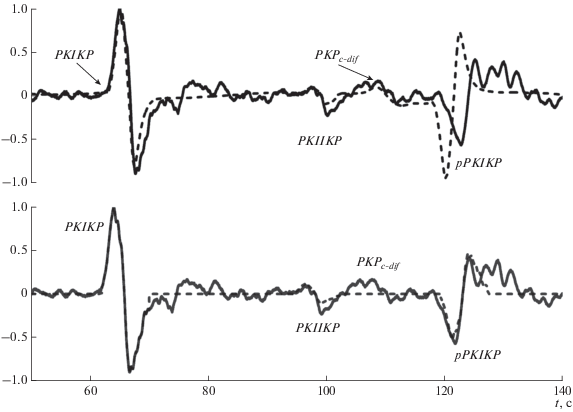 Верх: сравнение синтетической сейсмограммы для модели IASP91 (пунктир) и натурной сейсмограммы (сплошная); низ: результат решения оптимизационной задачи (6)–(7) для станции GZH в Китае (пунктир), зарегистрировавшей землетрясение 11.02.2015 г.
