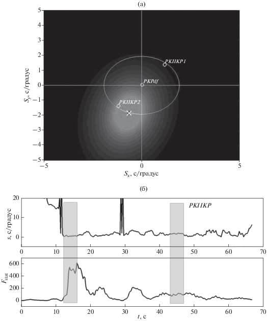 (а) F-K диаграмма во временном интервале с меткой PKIIKP; (б) медленность (s), и статистика Fstat; серыми полосами отмечены временные интервалы устойчивого сохранения медленности.