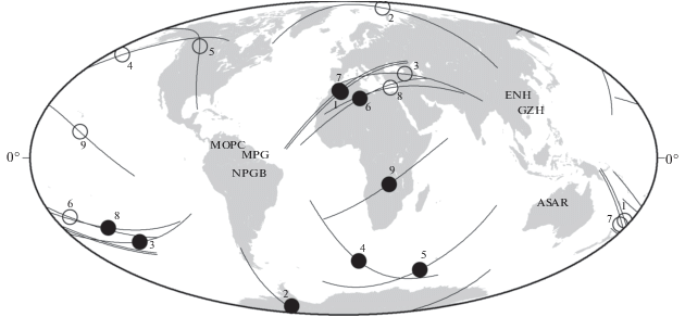 Возможные области низких скоростей поперечных волн (точки) и проекции пути во внутреннем ядре на поверхность Земли (кривые линии). Черные точки соответствуют длинному пути, светлые точки – короткому. Номера соответствуют порядковому номеру события в таблице.