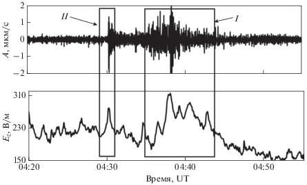 Пример вариаций вертикальной компоненты напряженности электрического поля в приземной атмосфере в период прихода сейсмического сигнала, вызванного землетрясением на архипелаге Додеканес (Греция) с магнитудой 5.1 (22.08.2014 г.); I – группа поверхностных волн, II – головная волна, А – амплитуда сейсмического сигнала.