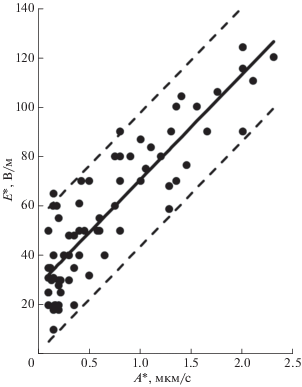 Особый интерес представляет возможная количественная связь между интенсивностью сейсмического воздействия и вызванными вариациями электрического поля. Полученная по итогам анализа в общей сложности 72 сейсмических событий [Локтев и др., 2015] зависимость между максимальной амплитудой сейсмического сигнала А* и максимальной амплитудой вариации Е* приведена на рис. 2. Несмотря на значительный разброс, данные рис. 2 свидетельствуют о том, что в целом при увеличении амплитуды сейсмического сигнала амплитуда вариаций электрического поля на земной поверхности растет. Для качественных оценок зависимость Е*(А*) допустимо представить в виде: