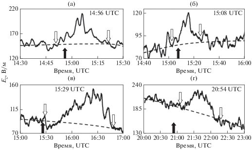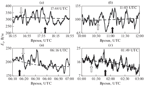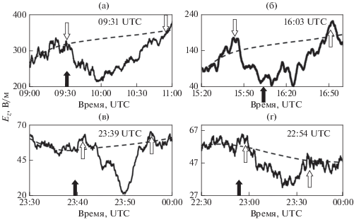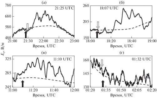 Вариации вертикальной компоненты напряженности электрического поля в приземной атмосфере в периоды землетрясений 25.02.2018 г. (а); 15.05.2020 г. (б); 22.10.2018 г. (в) и 09.11.2018 г. (г). Здесь и далее: время в очаге приведено в поле рисунка и отмечено вертикальной закрашенной стрелкой; вертикальными незакрашенными стрелками обозначены начало и окончание вызванных вариаций; штриховая линия ‒ линия тренда1.