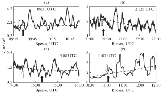 В качестве примера на рис. 6 приведены характерные примеры вариаций I, которые сопутствуют событиям 23.01.2018 г. (отклик Ez в виде отрицательной бухты), 29.03.2018 г. (отклик Ez в виде положительной бухты), 07.07.2019 г. (отклик Ez в виде положительной бухты) и 15.05.2020 г. (отклик Ez в виде знакопеременных вариаций).