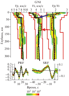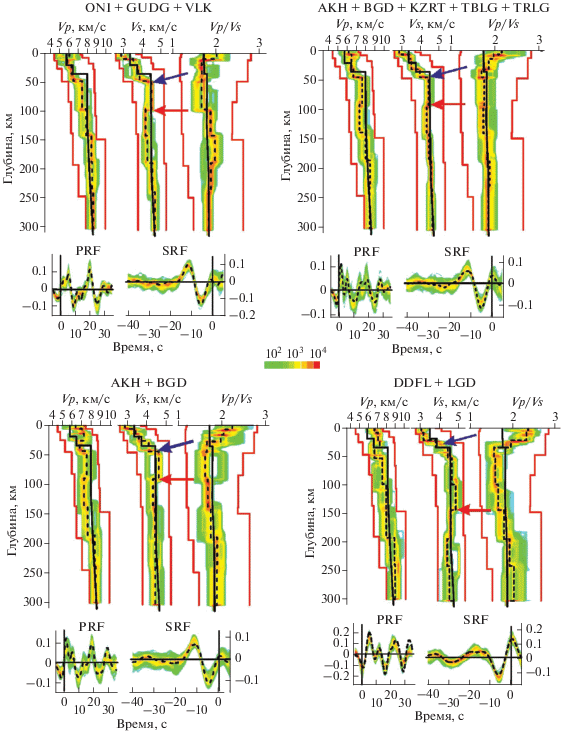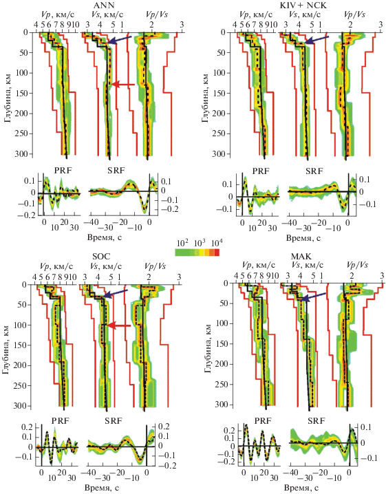 Скоростные разрезы, полученные совместным обращением PRF, SRF, dTs и dTp для станций ANN, SOC, KIV + NCK, MAK. Постериорное распределение Vs, Vp, Vp/Vs показано цветовым кодом. Медианы показаны пунктиром. Границы поиска показаны красными линиями. Значения модели IASP91 показаны черными линиями. Границы Мохо и LAB отмечены стрелками. Распределение синтетических PRF и SRF показано тем же цветовым кодом, что и параметры модели; значения, полученные миграцией реальных данных, показаны пунктиром.