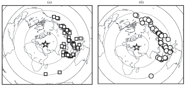 Эпицентры землетрясений, использованных при построении приемных функций P-волн (квадраты) и S-волн (кружки).