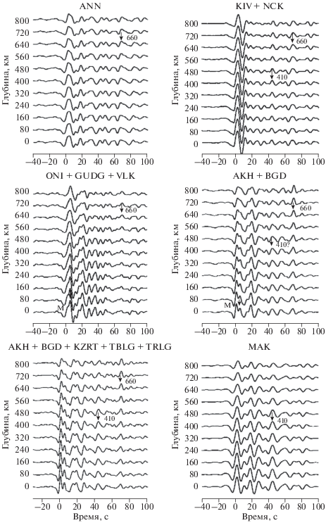 Исправленные значения времени для сейсмических фаз P410s и P660s показаны в табл. 1. Время P410s для группы KIV + NCK (44.1 c) практически совпадает со стандартным временем (44.0 с). Время для группы AKH + BGD (43.6 с) на 0.4 с меньше стандартного времени, время для группы AKH + BGD + KZRT + TBLG + TRLG (43.4 с) на 0.6 с меньше стандартного времени. Полученные оценки означают, что время P410s на станциях восточного Кавказа в среднем на 0.3 с меньше стандартного времени, а 410-км граница приподнята на 3 км. Эта величина сравнима с погрешностями оценок. На станции MAK, освещающей западную окраину Каспия, волна P410s запаздывает относительно стандартного времени на 0.7с, а 410-км граница погружена примерно на 7 км.