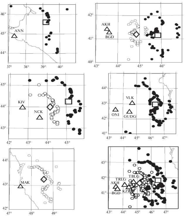 То же что на рис. 8, но для станций ONI + VLK + GUDG, AKH + BGD, AKH + BGD + KZRT + TBLG + TRLG, DDFL + LGD.