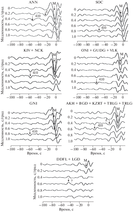 В шести случаях SRF на рис. 6 на времени около –54 с содержит отчетливую фазу с отрицательной полярностью и наибольшей амплитудой при медленности 0.4–0.6 с/град. Это волна S410p от глобальной границы на глубине около 410 км. Стандартная ошибка оценки времени этой волны составляет 0.4–0.5 с. Ее амплитуда обычно составляет около 0.03 при амплитуде шума менее 0.01. В приемных функциях для группы DDFL + LGD эта фаза не видна, но есть фаза с противоположной полярностью, вступающая с запозданием на несколько секунд. Это может быть обменная волна от кровли низкоскоростного слоя над 410-км границей [Vinnik, Farra, 2007]. Данные о волне S410p собраны в табл. 2, а точки обмена показаны на рис. 7.