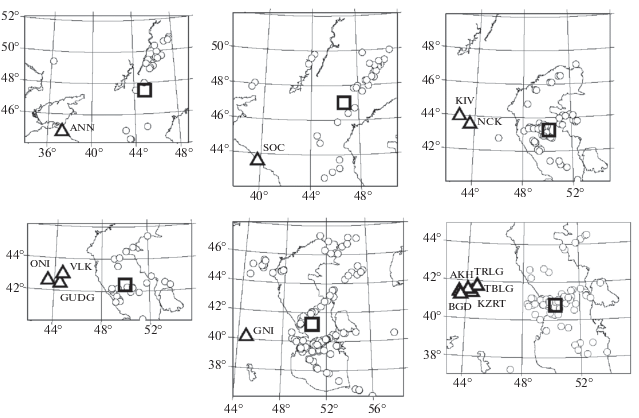 Мы исследуем структуру коры, верхней мантии и переходной зоны под Кавказом и Каспийской впадиной до глубины порядка нескольких сотен километров с помощью приемных функций продольных и поперечных волн [Vinnik, 1977; Farra, Vinnik, 2000]. Приемные функции получены по записям 16 сейсмических станций (рис. 1): AKH, ANN, BGD, GNI, GUDG, DDFL, KIV, KZRT, LGD, MAK, NCK, ONI, SOC, TBLG, TRLG, VLK. Станции GNI и KIV принадлежат мировой сейсмической сети GSN. Остальные станции принадлежат национальным сетям Грузии и России. Несколько доступных нам станций оказались очень шумными. Эти станции не показаны на рис. 1 и их записи исключены из рассмотрения. Mы объединили некоторые станции в группы: AKH + BGD, DDFL + LGD, KIV + NCK, ONI + GUDG + VLK, TBLG + TRLG + KZRT, AKH + BGD + TBLG + TRLG + KZRT. Записи станций ANN, SOC, MAK и GNI анализировались по отдельности.