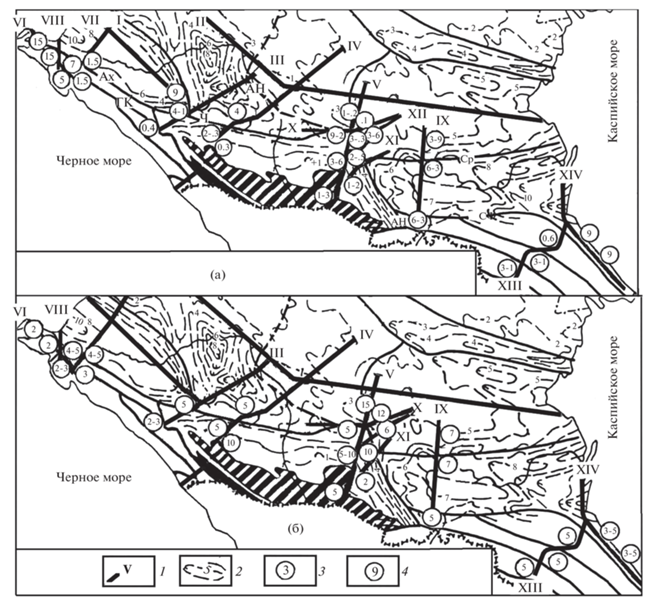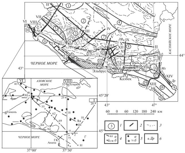 Схема расположения профилей МТЗ на схеме структурного районирования Северного Кавказа [Атлас карт…, 1998] (Нетреба А.В. и др.,1977)1. 1 – Структуры: 1 – Ростовский выступ; 2–9 – Скифская эпигерцинская плита (2 – Азово-Кубанская впадина; 3 – Восточно-Кубанский прогиб; 4 – зона Манычакских прогибов; 5 – Индоло-Кубанский прогиб; 6 – Адыгейский выступ; 7 – Ставропольский свод; 8 – Терско-Кумская впадина; 9 – Терско-Каспийский прогиб); 10–21 – складчатая система Большого Кавказа (10 – Таманский периклинальный прогиб; 11 – Новоросийская складчатая зона; 12 – выступы палеозоя; 13 – Северо-Кавказский краевой массив; 14 – зона Передового хребта; 15 – Минераловодский выступ; 16, 20 – Главный хребет Большого Кавказа; 17 – Известковый Дагестан; 18 – Аквалинскя моноклиналь; 19 – Боковой хребет); 2 – профили МОВЗ, МТЗ (а, б): I – Кубанский, II – Ейск-Каспийское море, III – Туапсинский, IV – Краснополянский, V – Приэльбрусский, VI – Тамань – Новороссийск, VII – Ачуев – Ходыженск, VIII – Новороссийск – Темрюк, IX - Владикавказ – Левокумское, Х, ХI, ХII – Минераловодский выступ, XIII – Талярата – Махачкала, ХIV – Махачкала – Дербент; 3 – изолинии глубин киммерийских доколлизионных комплексов (кристаллический фундамент); 4, а – разломы (Ан – Анапский, АН – Армавир-Невиномысский, Ах – Ахтырский, ВЛ – Владикавказский, ГК – Главный Кавказский, Дж – Джигинский, ПК – Предкавказский, СР – Срединный, Тр – Тырнаузский, Ч – Черкесский); б – надвиги (СФ – Северный фронтальный Восточного Кавказа, ТД – Терско-Дербенский, ГБК – Главный Большого Кавказа; М – Минераловодский, НЛ – Нагутско-Лысогоркий (границы Нальчик-Минераловодской флексурно-сдвиговой зоны)); 5: а – грязевые вулканы [Собисевич и др., 2005]: Ш - Шуро, Г – Гладковский, ЗЦ - Западный Цимбал; б – т.н. МТЗ; 6 – города: Кс – Кисловодск, Лв – Левокумск, Вл – Владикавказ, Мх – Махачкала, Др – Дербент, Тл – Талярата, СТ – Ставрополь. Круг – область максимальной концентрации гипоцентров коровых землетрясений (7–8 баллов). Квадрат – область Дагестанского клина.