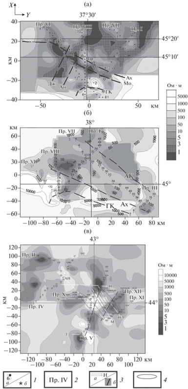 Под Минераловодским выступом аномалии повышенной проводимости (Пр. V, X, XII) согласуются с границами Эльбрусско–Минераловодской зоны сдвиговых нарушений [Милановский и др., 1989] и с глубинными разломами, ограничивающими Нальчик-Минераловскую флексурно-разрывную зону. Вдоль нее концентрируются эпицентры землетрясений [Габсатарова и др., 2020], примыкая или частично охватывая локальные зоны понижения скорости продольных волн и электрического сопротивления под Минераловодским выступом и Северо-Кавказским краевым массивом (рис. 9, рис. 10а, 10в). Восточнее Северо-Кавказского краевого массива (рис. 9а, 9в; т.н. 218–5132, 118–108) понижение скорости продольных волн объясняется с учетом изменения скорости и поперечных волн, ростом содержания SiO2 (с 63 до 65%) [Булин, Егоркин, 2000].
