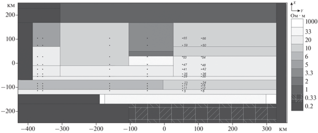 Обратная задача решалась для серии стартовых моделей, из которых выбиралась та, которая обеспечивала минимальные относительные среднеарифметические отклонения (δxy, δyx) экспериментальных $\left| {Z_{{{\text{ob}}}}^{{xy}}} \right|$, $\left| {Z_{{{\text{ob}}}}^{{yx}}} \right|$ от модельных $\left| {Z_{{{\text{in}}}}^{{xy}}} \right|$, $\left| {Z_{{{\text{in}}}}^{{yx}}} \right|$ и фаз импедансов ${\text{Arg}}Z_{{{\text{ob}}}}^{{xy}}$, ${\text{Arg}}Z_{{{\text{ob}}}}^{{yx}}$ от ${\text{Arg}}Z_{{{\text{in}}}}^{{xy}}$, ${\text{Arg}}Z_{{{\text{in}}}}^{{yx}}$ в т.н. МТЗ, под которыми картируются аномалии повышенной проводимости.