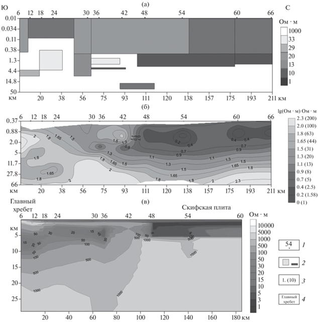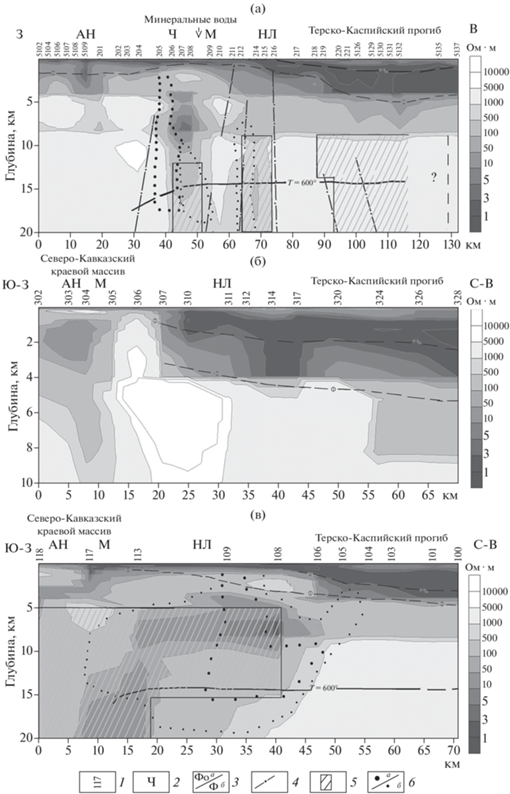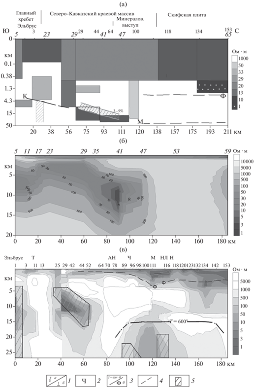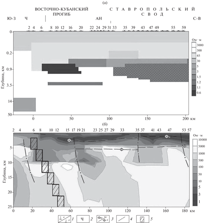 Согласно распределению параметров асимметрии, на частотах ниже 1 Гц, области квазидвумерной размерности – skew < 0.15, расположены под Ставропольским сводом и в Восточно-Кубанском прогибе. На низких частотах импедансы $Z_{{{\text{ob}}}}^{{{\text{max}}H}}$ ориентируются по азимутам 70°–90°, а на средних по –30°–(–40°), близким к структурным линиям региона. Двумерная инверсия кривых $\rho _{{{\text{ob}}}}^{{{\text{max}}H}}$ и их фаз Arg$Z_{{{\text{ob}}}}^{{{\text{max}}H}}$, проведенная в режиме Е‑поляризации (рис. 6а), выделила под складчатой системой Кавказа (т.н. 2–3) на глубинах Zin = 10–12 км блок с ρin = = 5 Ом ⋅ м мощностью Нin = 20–30 км. Метод подбора 3D-моделей разделил его на два, сместив верхний блок с ρin = = 20 Ом ⋅ м на глубину 15 км, а нижний с ρin = = 40 Ом ⋅ м до Zin = 30 км.