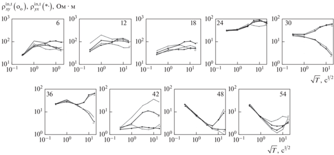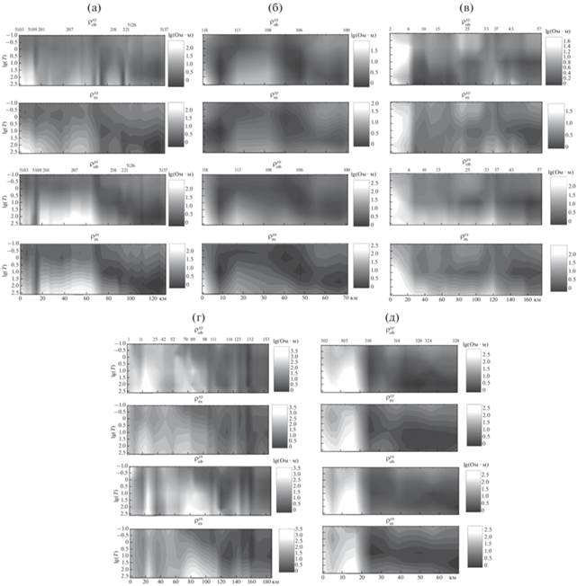 Соответствие экспериментальных кривых $\rho _{{{\text{ob}}}}^{{xy}}$, $\rho _{{{\text{ob}}}}^{{yx}}$, полученным при 3D-инверсии $\rho _{{{\text{in}}}}^{{xy}}$, $\rho _{{{\text{in}}}}^{{yx}}$, является критерием надежности рассматриваемых геоэлектрических разрезов. Их частотные характеристики представлены на рис. 7. Видно, что программа WSINV3DMT на периодах Т > 10–50 c дает сглаженные изменения значений $\rho _{{{\text{in}}}}^{{xy}}$, $\rho _{{{\text{in}}}}^{{yx}}$, вызванных на кривых $\rho _{{{\text{ob}}}}^{{xy}}$ и $\rho _{{{\text{ob}}}}^{{yx}}$ локальными неоднородностями, расположенными под профилями X (а), XI (б), XII (в), V (г) и IV (д). То есть, она частично гасит проявление “S-эффекта” на кривых $\rho _{{{\text{ob}}}}^{{xy}}$, $\rho _{{{\text{ob}}}}^{{yx}}$ при выделении региональных аномалий проводимости, залегающих в нижней части разреза. Аналогичные выводы получены для других профилей МТЗ [Белявский 2022; 2023].