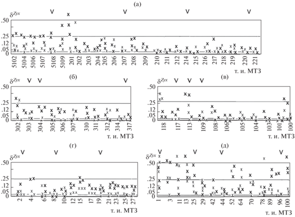 Относительные среднеарифметические погрешности (δyx) 3D-инверсии кривых $\rho _{{{\text{ob}}}}^{{yx}}$ на профилях МТЗ: X (а), XI (б), XII (в), IV (г) и V (д). Кресты: малые для периодов 0.1 < T < 1 с, большие – 10 < T < 300 с. V – низкоомные зоны.