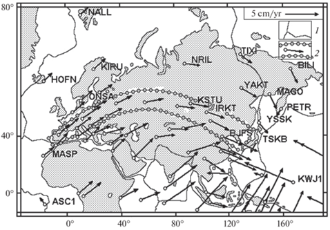 Судя по результатам геодезических GPS-измерений (в системе координат ITRF) для территории северной части Евразиатского континента (сЕк) (рис. 1) его западная половина смещается в В–СВ направлении, а восточная – в В–ЮВ. Движение в целом идет по пологой, выпуклой к северу и столь плавной дуге, что это не позволяет предположить (на протяжении всей ее с запада на восток ~12 000 км) разделение сЕк на несколько частей – блоков, субплит. Меньше, но кое-где обращает на себя внимание то, что движение сЕк в восточном направлении происходит со скоростью, устойчиво нарастающей в том же восточном направлении.