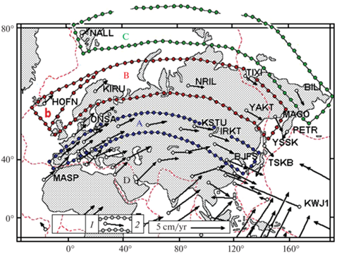 Севернее этой последней можно выделить (в том числе по аналогии с этой дугой А) еще две дугообразных полосы – дугу В (о.Исландия–Фенноскандия, GPS-станции NRIL–YAKT–MAGO) и предполагаемую дугу С (о.Шпицберген, станция NALL на западе и Чукотский полуостров, станция BILI на востоке). В пределах этих двух полос векторы скоростей смещений в восточном направлении немногочисленных GPS-станций демонстрируют расположение в плане, аналогичное таковому в предыдущей полосе А. Промежутки между перечисленными дугами – это полосы, не затронутые геодезическими измерениями.