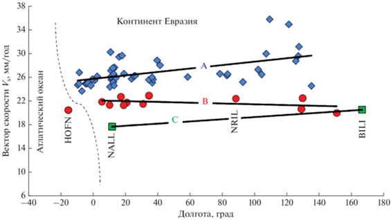 Расположенная еще далее на север дуга С в значительной степени домысливается по аналогии с двумя предыдущими дугами. Она опирается всего на две станции GPS-измерений – на о. Шпицберген (NALL) на западе дуги и на Чукотском полуострове (BILI) на востоке (рис. 2). В первом случае полный вектор горизонтального смещения (~17–18 мм/год) ориентирован в СВ направлении, во втором (~20–21 мм/год) – в ЮВ направлении [SOPAC]. Приведенные цифры позволили показать возможное положение линии апроксимации. Она, при всей ее недостаточной обоснованности, определенно свидетельствует в пользу того, что та часть сЕк, которая соответствует дуге С, в отличие от предыдущей дуги В, перемещается в восточном направлении с некоторым в этом же направлении увеличением скорости. Об этом свидетельствует наклонность упомянутой линии апроксимации. При этом наклоны таких линий, отвечающих дугам А и С, оказываются практически одинаковыми, что означает сходное увеличение скоростей восточных смещений GPS-станций этих двух дуг.