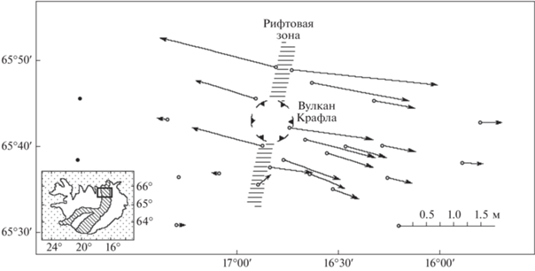 Результаты геодезических измерений в северной части о.Исландия (по работе [Wendt et al., 1985]) (на врезке к рисунку прямоугольником обозначен район работ; косой штриховкой отмечена рифтовая долина).