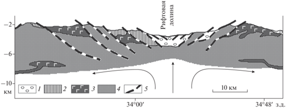 Схема геологического строения океанической коры осевой части Срединно-Атлантического хребта на профиле, пересекающем рифтовую долину на широте 7° с.ш. [Савельева, 2004]: 1 – базальты; 2 – дайки долеритов; 3 – габбро; 4 – реститовые мантийные ультрамафиты; 5 – разломы (надвиги или поддвиги – авторы); стрелками показано направление движения мантийного материала.