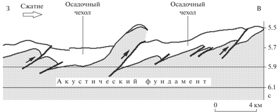 Напряжения субгоризонтального сжатия обычно реализуются образованием надвиговых и некоторых других, сопряженных с ними, дислокаций. И действительно, “… сейсмический имидж океанической коры Атлантики определяется прежде всего наличием в ней большого количества наклонных отражающих горизонтов, интерпретируемых в качестве разломов. В обстановке горизонтального сжатия наличие наклонных разломов в коре неизбежно приводит к возникновению надвигов или поддвигов … .” [Разницын, 2004, с. 101]
