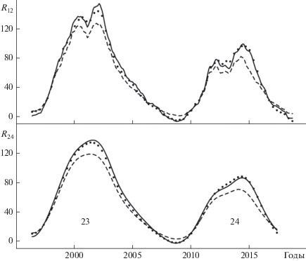 Средние за 12 мес. (R12) и сглаженные (R24) индексы солнечной активности в солнечных циклах 23 и 24: Rf12 и Rf24 – сплошные линии, Rr12 и Rr24 – штриховые линии, T12 и T24 – точки.