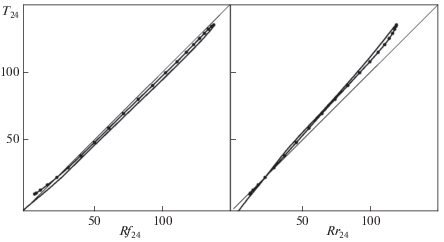 Связь сглаженного индекса T24 с индексами Rf24 и Rr24 для солнечного цикла 23. Фаза роста цикла выделена точками.