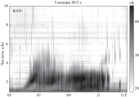 На рисунке 1 показана спектрограмма ОНЧ-излучений в интервале 05‒15 UT (08‒ 18 MLT), полученная в КАН 5 января 2015 г. Верхняя граничная частота спектрограммы (10 кГц) выбрана для исключения радиопомех дальних радиостанций, работающих на частотах выше 10 кГц, а низкочастотная отсечка (1 кГц) для исключения возможных индустриальных помех промышленной сети. При некотором воображении ОНЧ-спектрограмма напоминает очертания лежащего на земле слона, поэтому мы назвали это ОНЧ-событие “слоном”.