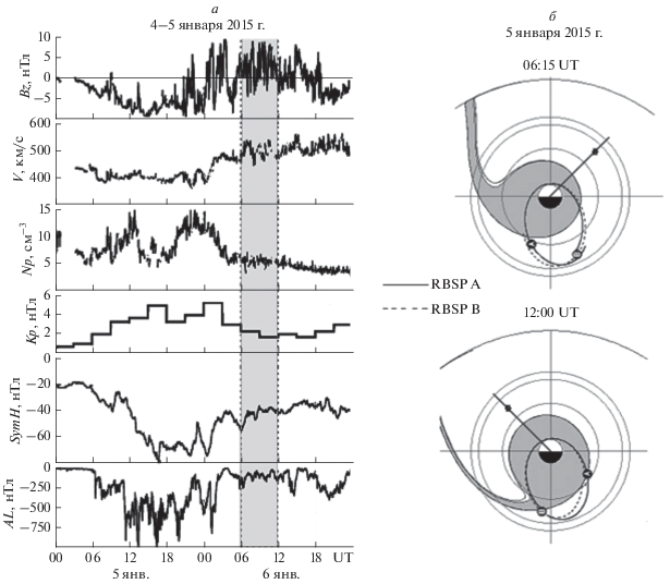 Условия космической погоды (а) ‒ 4‒5 января 2015 г., т.е. до и во время обсуждаемого дневного всплеска ОНЧ- излучений (выделен серым цветом): вариации Bz ММП, скорости (V) и плотности (Np) солнечного ветра, планетарной геомагнитной активности (Kр), интенсивности кольцевого тока (SymH) как индикатора магнитной бури и AL-индекса суббуревой активности; (б) – положение плазмопаузы по данным спутников RBSP в начале и середине ОНЧ шумовой бури.