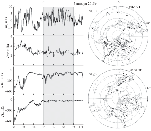 Всплеск дневных ОНЧ-излучений (ОНЧ шумовая буря) начался около 06 UT после поворота Bz ММП к северу. В течение всего ОНЧ-всплеска направление ММП практически оставалось неизменно северным (положительные значения Bz ММП). Всплеск прекратился с поворотом Bz ММП к югу около 12 UT. Динамическое давление солнечного ветра (Psw) в течение всего ОНЧ-всплеска оставалось стабильным с незначительными флуктуациями, но относительно высоким ~3 нПа, что свидетельствует о значительном поджатии магнитосферы. В начале всплеска ОНЧ-излучений, в 06‒07 UT, наблюдалось некоторое возрастание геомагнитной активности (рис. 3а), что может быть результатом предшествующих отрицательных значений Bz ММП. Эти геомагнитные возмущения развивались в ночном секторе Земли, что видно на верхней карте SuperMag (рис. 3б) глобального распределения векторов возмущений магнитного поля, повернутых на 90° по часовой стрелке, чтобы показать направление ионосферных эквивалентных электрических токов. В дневном секторе (в Скандинавии) в тот интервал времени значительных магнитных возмущений не наблюдалось, что видно и по вариациям IL-индекса (рис. 3а).
