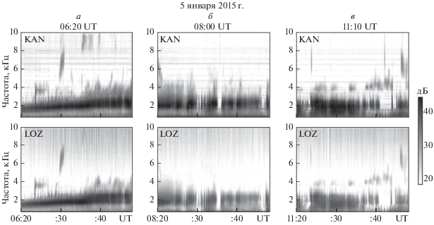 Первое событие (06:10‒06:12 UT) состояло из последовательности двух коротких (20 и 30 с) шумовых всплесков с падающей частотой [Маннинен и др., 2017], сначала излучения отмечались в полосе частот ~6.5‒9.0 кГц, а затем – в полосе ~5.0–7.0 кГц (рис. 5а). По данным измерений в ЛОВ оба всплеска пришли в ЛОВ с юго-запада. В то же время в КАН волны приходили вдоль меридиана, но не известно, расположена область выхода волн к северу или к югу от КАН, поскольку определение азимута прихода волн в КАН возможно лишь с неоднозначностью в 180°. Исходя из подобия спектрограмм в КАН и ЛОВ, можно предположить, что излучения, зарегистрированные в этих точках, имели общий источник, расположенный согласно данным ЛОВ к юго-западу от ЛОВ. В таком случае можно заключить, что волны в КАН приходили с юга, а не с севера.
