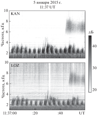 В конце основного ОНЧ-всплеска (рис. 4в) полоса хисса полностью сменилась квазипериодическими (QP) излучениями. На рис. 6 приведены 1-мин спектрограммы этих излучений в КАН и ЛОВ. Видно, что очень короткие дискретные сигналы в полосе частот ~2–3 кГц характеризуются периодом повторения ~3 с. Такие QP излучения неоднократно регистрировались как на земной поверхности [Engebretson et al., 2004; Manninen, 2005; Manninen et al., 2014], так и в магнитосфере [Bespalov et al., 2010].