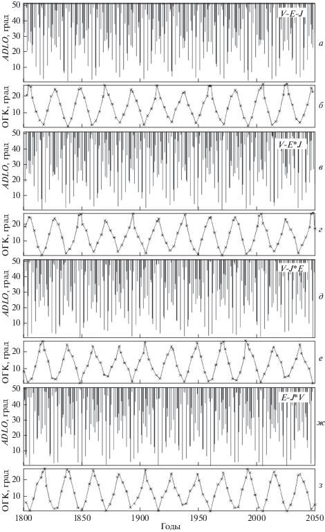 На рисунке 2 для периода с 1800 по 2050 гг. представлены данные по СРД (ADL, ADLO), ограниченные максимальными значениями 50°, для всех четырех конфигураций. В отличие от рис. 1, здесь из-за большого количества данных и большого временнóго интервала широкие пики выглядят как линии. Из этого рисунка отчетливо видно, что минимальные значения СРД (рис. 2а, 2в, 2д, 2ж) описывают четкую периодическую зависимость (имеются в виду огибающие минимальных значений СРД). Эти огибающие минимальных значений СРД, ограниченные значениями 25°, представлены на рис. 2б, 2г, 2е, 2з. Более высокий уровень ограничения не представляет интереса, поскольку там планеты уже располагаются в большом секторе долгот. Наиболее гладко огибающие выглядят при ограничении ~25°. Далее в этом исследовании будут использоваться только огибающие кривые минимальных значений СРД для всех четырех конфигураций.