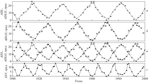 На столетнем временнóм интервале (1900–2000 гг.), который приведен и на рис. 2, покажем, как рассчитывался планетный индекс солнечной активности. На рис. 3а приведена огибающая минимальных значений СРД (ADL, ADLO) для планет Венеры, Земли и Юпитера (сплошная линия, соединяющая кружочки, конфигурация V–E–J, основная периодичность в ней – 22 года). Кроме того, здесь приведена огибающая минимальных значений СРД (ADLO) для конфигурации V–E * J (крестики). Как видим, обе зависимости протекают в фазе, но при самых минимальных значениях точки конфигурации V–E * J располагаются между точками конфигурации V–E–J (интервал между ними 1.6 года). На рис. 3б также приведены огибающие минимальных значений СРД (ADLO) для конфигураций V–J * E и E–J * V (их точки чередуются с интервалом 1.6 года, основная периодичность в них – 22 года), но эти огибающие находятся в противофазе с огибающими рис. 3а. Максимальному гравитационному воздействию на Солнце соответствуют значения СРД, близкие к нулю – это линейные конфигурации планет.