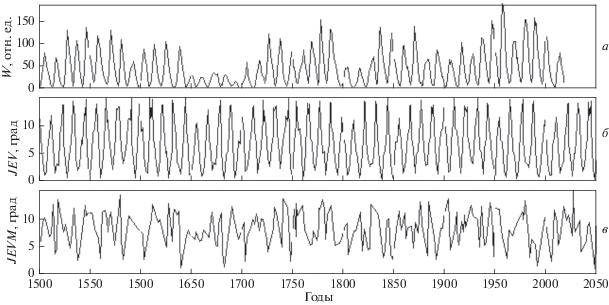 Для периода с 1500 по 2050 гг.: (а) – числа Вольфа (W); (б) – данные индекса JEV; (в) – индекс линейных конфигураций планет Меркурий, Венера, Земля и Юпитер (JEVM).