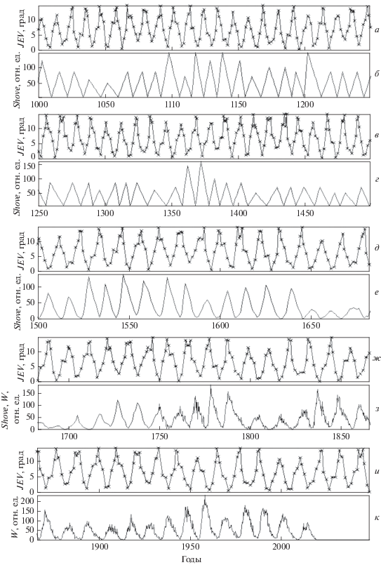Для периода с 1000 по 2050 гг.: данные индекса JEV (а, в, д, ж, и), ряд солнечной активности (Shove, 1000–1699 гг.) (б, г, е) и числа Вольфа (W) для периода с 1700 по 2018 гг. (з, к).