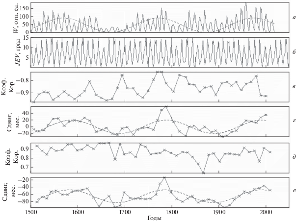 Фазовые соотношения СА и индекса JEV, полученные при кросскорреляционном анализе: (а) – ряд солнечной активности по числам Вольфа (W, штриховая линия – спектральная составляющая с периодом 203.5 лет); (б) – данные индекса JEV (град); (в) – коэффициенты корреляции для максимумов СА; (г) – опережения – отставания максимумов СА от минимальных значений индекса JEV, месяцы (штриховая линия – спектральная составляющая с периодом 202.1 лет); (д) – коэффициенты корреляции для минимумов СА; (е) – отставание минимумов СА от минимальных значений индекса JEV, месяцы (штриховая линия – спектральная составляющая с периодом 204.6 лет).