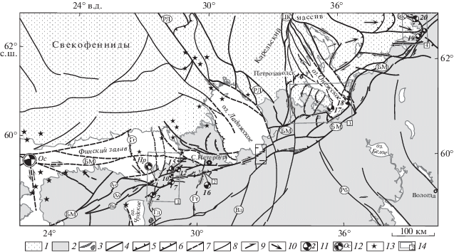Структурно-кинематическая схема Балтийско-Мезенской зоны (с использованием данных [1, 2, 8, 11, 42, 48, 52]). Зоны нарушений (на схеме): БМ – Балтийско-Мезенская, Ас – Асери, Ах – Ахтме, Вв – Вийвиконна, Гд – Гдовская, Гг – Гогландская, Гт – Гатчинская, РЛ – Раахе-Ладожская, Вл – Волховская, Рб – Рыбинская, ЦК – Центрально-Карельская, ВК – Восточно-Карельская. 1 – архей–палеопротерозойские комплексы фундамента Балтийского щита; 2 – осадки фанерозойского чехла и границы стратиграфических комплексов; 3 – тектонические валы и поднятия; 4–8 – разрывы: 4 – преимущественно сдвиги, 5 – взбросы и надвиги, 6 – сбросы, 7 – в акватории, 8 – второстепенные; 9–10 – направления смещений: 9 – сдвиговых, 10 – тангенциальных; 11 – стереограммы палеонапряжений главного структурно-кинематического парагенеза, квадранты: растяжения (черный), сжатия (белый) и номера пунктов наблюдений; 12 – решения сейсмофокального механизма для Осмуссаарского (Ос) и Нарвского (Нр) землетрясений; 13 – эпицентры современных и исторических землетрясений; 14 – изученные сегменты: 1 – Лужский, 2 – Дудергофский, 3 – Южно-Онежский, 4 ‒ долина р. Онега