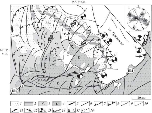 Геолого-структурная схема Южно-Онежского сегмента (с использованием данных [14, 34]). Равноплощадная стереографическая проекция I полюсов слоистости (нижняя полусфера) для Андомской возвышенности (n = 234, изолинии –1/2/3/4/6/8%) (пункт 18). 1–2 – палеопротерозойские комплексы фундамента: 1 – шокшинские кварцито-песчаники, 2 – силл габбро-долеритов; 3–4 – отложения чехла: 3 – верхнего венда, 4 – девона; 5 – валы и антиклинали; 6–10 – разрывы: 6 – преимущественно сдвиги, 7 – взбросы и взбросо-сдвиги, 8 – сбросы, 9 – в акватоии, 10 – второстепенные; 11–12 – направления перемещений: 11 – сдвиговых, 12 – тангенциальных; 13 – стереограммы палеонапряжений главного структурно-кинематического парагенеза, квадранты: растяжения (черный), сжатия (белый) и номера пунктов наблюдений; 14 – линия сейсмопрофиля I–II; 15–16 – структурные элементы на стереограмме: 15 – шарниры складок, найденные: а – геометрически, б – по замерам в обнажениях; 16 – осевые плоскости складок F1, F2