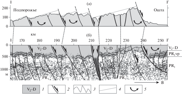 Интерпретация сейсмического профиля, пройденного к югу от р. Свирь вдоль линии I–I' (с использованием данных [37]). (а) – гипсометрический профиль, иллюстрирующий асимметричную морфологию современного рельефа; (б) – сейсмический разрез и сквозные разрывы, пронизывающие фундамент и чехол. 1 – отложения верхнего венда и девона; 2 – разрывы и направления смещений; 3 – складчатые палеопротерозойские комплексы; 4 – наклоненные поверхности выравнивания; 5 – направление антитетического вращения при сбросовых смещениях