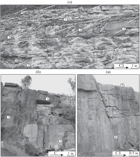 Листрическая морфология сбросов, вероятно, контролируется пологими поверхностями срыва – детачментами, в качестве которых можно рассматривать соленосный горизонт, вскрытый параметрической скважиной в подошве палеопротерозойских комплексов Онежской структуры [34], глубинные сейсмические отражения, выявленные на сейсмопрофиле 1-ЕВ, а также субслойные срывы в подошве и внутри осадочного чехла. Признаки тектонической расслоенности шокшинской толщи отмечены в карьерах юго-западного Прионежья (см. рис. 10, севернее пункта 17). В ее строении обособлены многочисленные субслойные срывы, которые оперяются сколами Риделя (R) c небольшими (до 0.5 м) сбросовыми смещениями (рис. 12, а). Выше по разрезу развиты сбросы и сбросо-сдвиги, среди которых по соотношениям с поверхностями ледниковой экзарации можно выделить древние и новейшие постледниковые нарушения. Последние представлены скальными уступами высотой до нескольких десятков метров, на поверхности которых развиты зеркала скольжения, а в основании – глыбовые отвалы, отброшенные сейсмическим ударом на большие расстояния от скалы (см. рис. 12, б, см. рис. 10, пункт 17). Подобные образования широко распространены и рассматриваются в качестве новейших сейсмодислокаций [13]. Многочисленные малоамплитудные сбросы и сбросо-сдвиги смещают поверхности ледникового выравнивания и по этому признаку могут быть отнесены к новейшим нарушениям (см. рис. 12, в). Каскадная система новейших сбросов и связанных с ними ступенчатых уступов развита вдоль западных бортов Онежского озера и заливообразного выступа осадков чехла, вытянутого вдоль оси Западно-Онежской синклинали. Все эти нарушения имеют восточную экспозицию и динамически связаны с Балтийско-Мезенской зоной (см. рис. 10, пункт 17).