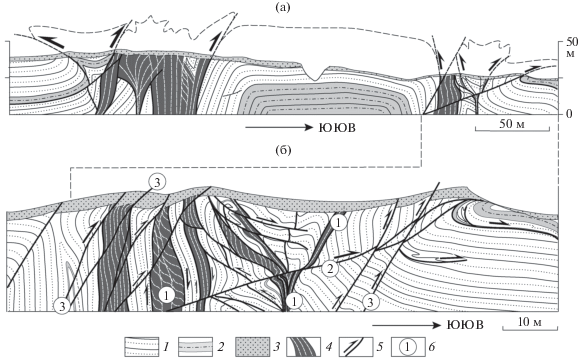 Антиклинали имеют сложное внутреннее строение, обусловленное сочетанием мелких и крупных изоклинальных, пережатых и диапироподобных складок течения (см. рис. 13, б). Центральные части антиклиналей и их крылья осложнены зонами нарушений, в которых первичная слоистость почти полностью затушевана развитием вторичных текстур – полосчатости и сланцеватости. Ширина складчато-разрывных зон достигает 100 м. В их строении участвуют крутопадающие и дивергентные нарушения, которые в разрезе часто образуют положительные структуры цветка – индикаторы транспрессивной обстановки (см. рис. 13). Эти нарушения являются доледниковыми герцинскими структурами: они смещены пологими малоамплитудными надвигами (гляциодислокации) и с несогласием перекрыты тонким (0.5–2 м) слоем морены. Некоторые крутопадающие взбросо-сдвиги, конформные герцинским нарушениям, проникают в четвертичные отложения, формируют уступы и карманы в их подошве. В кинематическом отношении эти новейшие разрывы почти полностью идентичны герцинским структурам, но отличаются от них тем, что они их часто секут, проникают в ледниковые отложения и имеют малые (1–2 м) амплитуды смещений (см. рис. 13, б).