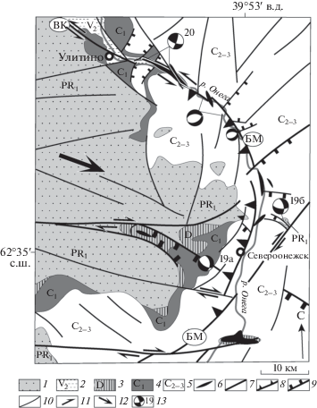 Геолого-структурная схема долины р. Онега (с использованием данных [23]). Зоны нарушений: БМ – Балтийско-Мезенская, ВК – Восточно-Карельская. 1 – палеопротерозойские комплексы фундамента; 2–5 – отложения чехла: 2 – верхнего венда, 3 – девона, 4 – нижнего карбона, 5 – среднего–верхнего карбона; 6 – тектонические валы и антиклинали; 7–10 – разрывы: 7 – преимущественно сдвиги, 8 –взбросо-сдвиги, 9 – сбросы, 10 – второстепенные; 11–12 – направления перемещений: 11 – сдвиговых, 12 – тангенциальных; 13 – стереограммы палеонапряжений главного структурно-кинематического парагенеза,квадранты: растяжения (черный), сжатия (белый) и номера пунктов наблюдений