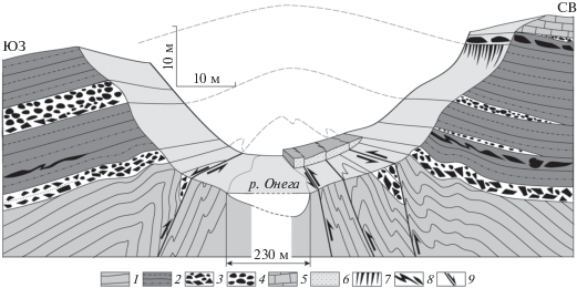 Блок-диаграмма строения складчато-разрывных структур долины р. Онега (пункт 20). 1 – алевролит-глинистые отложения верхнего венда; 2–4 – пестроцветные отложения визейского яруса: 2 – алевролит-глинистые, 3 – брекчированная кора выветривания, 4 – конгломераты; 5 – известняки и мергели серпуховского яруса; 6 – делювиальные отложения квартера; 7 – нептунические дайки; 8 – горизонты палеосейсмитов; 9 – разрывы и направления смещений