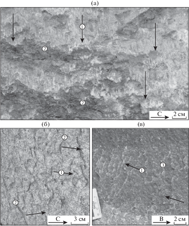 Зеркала скольжения в известняках (а), габбро-долеритах (б) и песчаниках (в). Обозначены: 1 – штрихи скольжения, 2 – уступы, 3 – тонкая чешуйчатость.