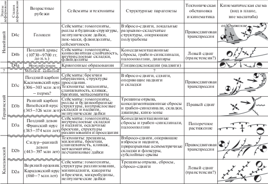 Новейший этап. Данный этап развития Балтийско-Мезенской зоны был связан с накоплением поздне- и постледниковых озерных и озерно-аллювиальных отложений позднего неоплейстоцена–голоцена. На ранней стадии D4b (поздний дриас, 10 730–9700 гг. до н.э. [8]) Балтийско-Мезенская зона развивалась в условиях левосдвиговых смещений, возможно, в режиме транстенсии, что сопровождалось проявлением сейсмических событий и связанных с ними структур растяжения таких, как конседиментационные сбросы, грабен-синклинали и нептунические дайки (см. табл. 1). На поздней стадии D4c в голоцене произошла кинематическая инверсия, после которой Балтийско-Мезенская зона развивалась в обстановке правосдвиговой транспрессии. Интенсивные деформации при этом проявились в узлах пересечения Балтийско-Мезенской зоны с поперечными нарушениями, в сегментах ее изгиба и виргации, в области которых формировались новейшие антиклинальные поднятия (Вайварские, Дудергофские) и депрессии (Онежская, Ладожская, Мокшинская) (см. табл. 1). Новейший тектогенез сопровождался развитием сейсмодислокаций и горизонтов палеосейсмитов, деформациями голоценовых осадков и формированием структур прорыва газогидратов – пок-маков. Крупное Свирско-Оятское сейсмическое событие (4.5–2.0 тыс 14С л.н. [5, 6]) произошло на юго-востоке Ладожского озера.